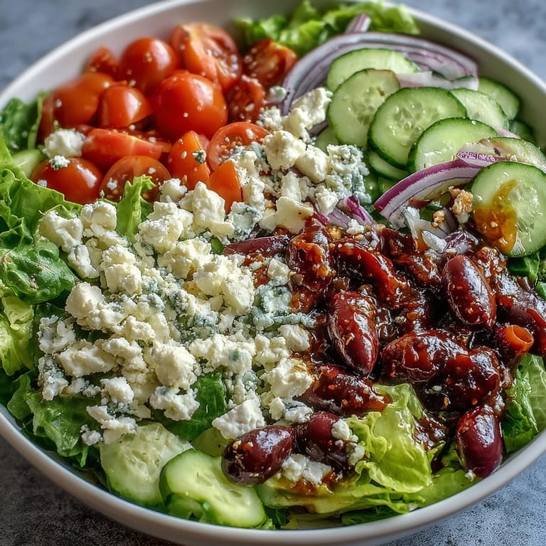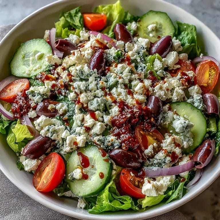 In Greece, this salad—known as 'horiatiki'—is an institution. It's a celebration of the Mediterranean diet at its finest: simple, nutritious, and bursting with flavor. What makes this version special is the careful balance of each ingredient, ensuring you get the perfect bite every time. The red wine vinaigrette ties everything together with aromatic oregano and just the right amount of garlic, creating a dressing worthy of its legendary status.